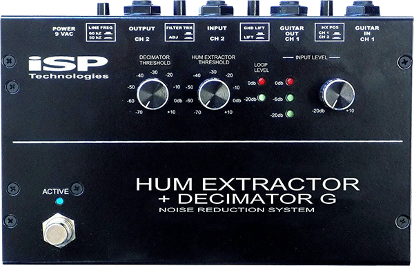 ISP Technologies introduces the revolutionary patent pending HUM EXTRACTOR + DECIMATOR G, two channel, ultimate noise reduction system. After years of musicians fighting the major noise problem of power line frequency hum, ISP Technologies eliminates this dreaded noise with the new patent pending HUM EXTRACTOR. Power line frequency hum is most commonly caused by stray magnetic fields generated from transformers or power lines in close proximity to the instrument pickups. While Hum Bucking pickups have been in use for years to help reduce this problem, if the level of hum is severe, even Hum Bucking pickups are not enough and many players still prefer the sound quality and tone of single coil pickups.