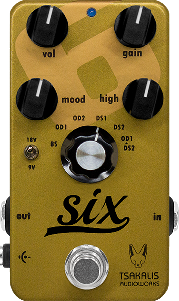 Vol, gain, mood, high, switch 6 positions (bs / od1 / od2 / ds1 / ds2 / od1+ds2), switch 9v / 18v.