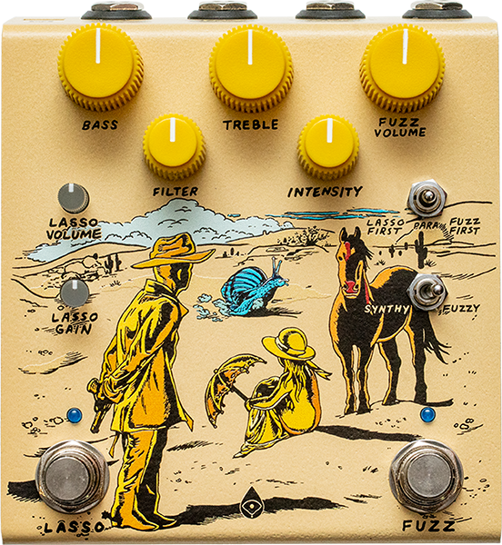 Bass, treble, fuzz volume, filter, intensity, lasso volume, lasso gain, switch para / lasso first / fuzz first, switch synthy / fuzzy.