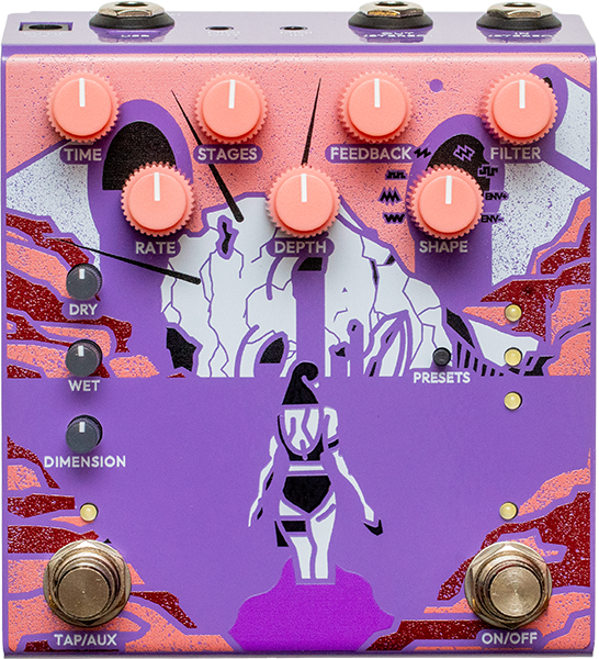 Time, stages, feedback, filter, rate, depth, shape, dry, wet, dimension, switch presets.