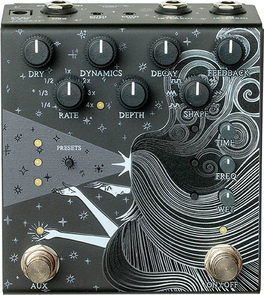 Le footswitch Aux de la Sunlight peut être utilisé en momentané ou enon/off pour le tap tempo, le sustain infini, le maintien de la réverb ou le changement de preset. Il est possible d'enregistrer 3 presets avec des indicateurs LED et d'utiliser l'entrée expression pour un contrôle externe de n'importe quel paramètre. Offrant une grande flexibilité, la Sunlight Stereo est totalement compatible MIDI avec des presets sélectionnables via des messages Program Change et tous les paramètres accessibles et contrôlables via CC.
