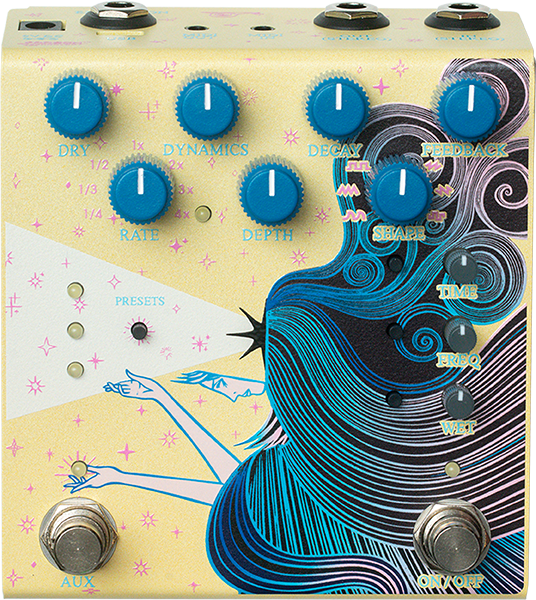 Le footswitch Aux de la Sunlight peut être utilisé en momentané ou enon/off pour le tap tempo, le sustain infini, le maintien de la réverb ou le changement de preset. Il est possible d'enregistrer 3 presets avec des indicateurs LED et d'utiliser l'entrée expression pour un contrôle externe de n'importe quel paramètre. Offrant une grande flexibilité, la Sunlight Stereo est totalement compatible MIDI avec des presets sélectionnables via des messages Program Change et tous les paramètres accessibles et contrôlables via CC.